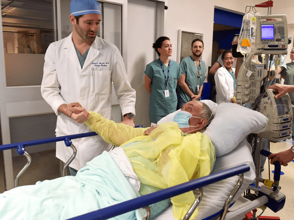 Daniel Borsuk et son équipe se préparent également minutieusement, car il s’agit d’une intervention chirurgicale rare. Depuis 2005, seulement 40 de ces opérations ont été réalisées dans le monde, et aucune au Canada. Au cours de l’été 2017, les chirurgiens, anesthésistes et infirmiers s’entraînent pendant plusieurs jours sur deux cadavres, dans le sous-sol de l’hôpital de Montréal. Ils répètent et améliorent leur technique, mémorisant chaque étape, de la première incision au dernier point de suture.