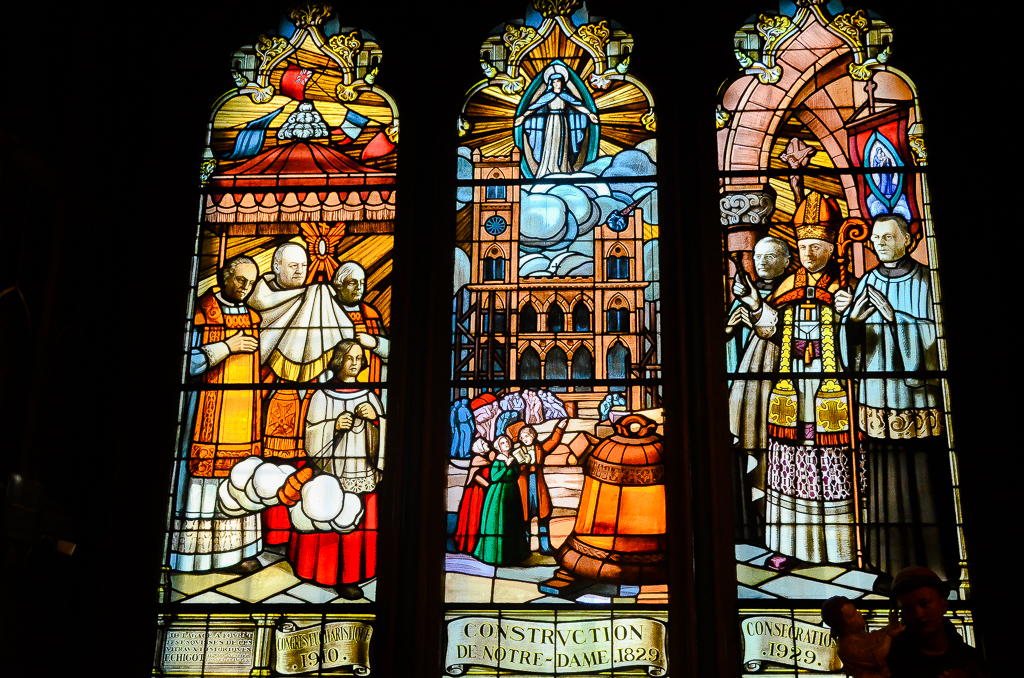 L’intérieur, habillé de bleu et d’or, est enrichi de boiseries, de tableaux religieux et de vitraux colorés créés par l’artiste québécois Jean-Baptiste Lagacé. Ces vitraux racontent des scènes de l’histoire du Vieux-Montréal.