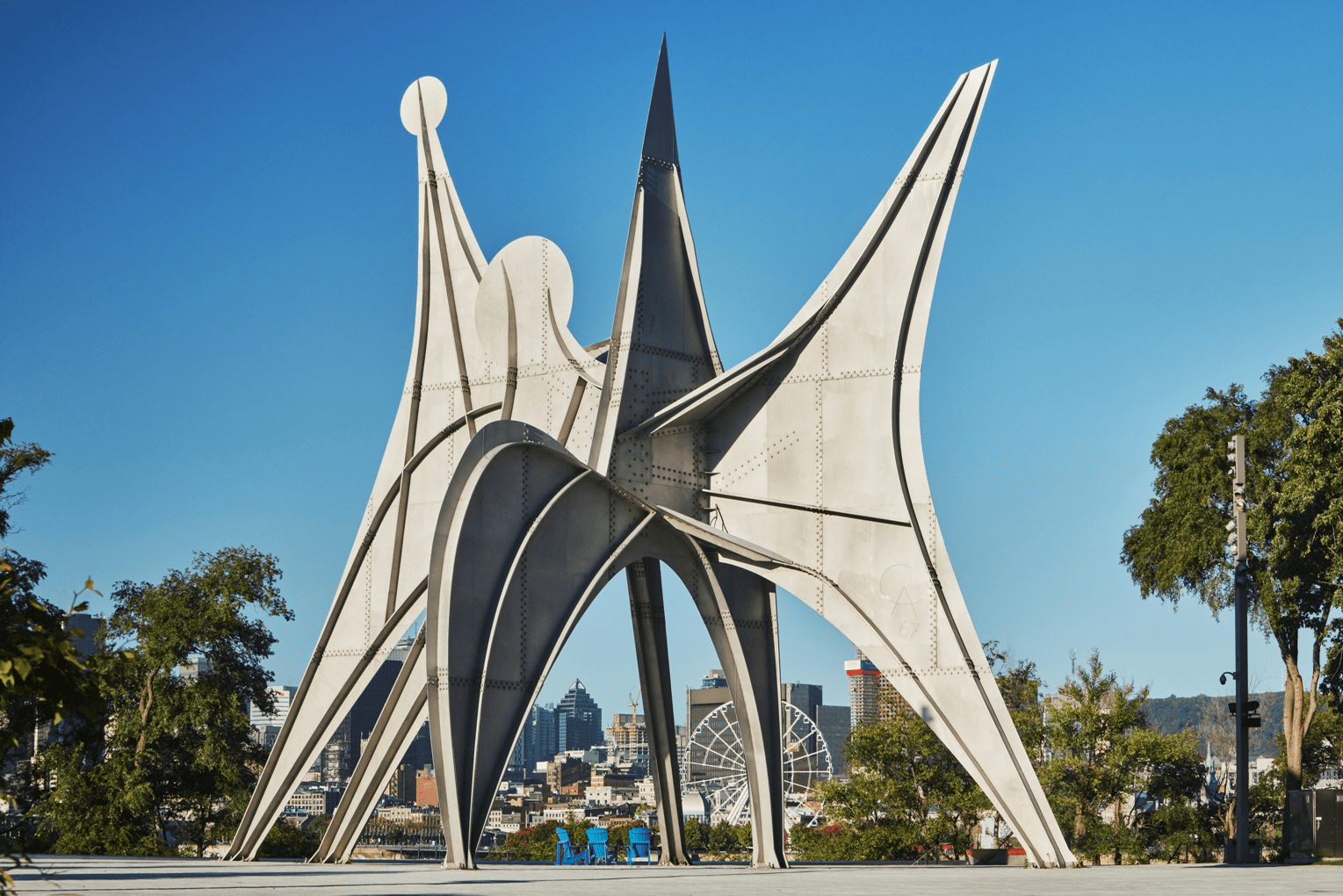Абстрактная композиция из пяти арок, стоящих на шести тонких столбах, вершины которых украшены двумя кончиками и тремя дисками. Сложная паутина изготовлена ​​из нержавеющей стали и создает игру тени и света. Автором проекта стал Александр Колдер, таким образом пытавшийся передать человеческий прогресс и могущество.