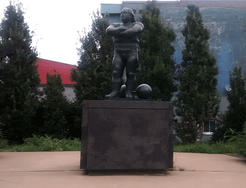 Луи Сир — известный спортсмен, родом из Сен-Сиприена, который в свои годы имел статус «сильнейшего человека в мире», а также приложил много усилий для популяризации спорта среди населения. Мужчина был вторым из семнадцати детей в семье, в подростковом возрасте работал лесорубом, а впоследствии открыл в себе большую силу. Он изображен в традиционной спортивной форме тяжеловеса. У ног лежит важный атрибут – штанга. Над бронзовой статуей работал скульптор Роберт Пеллетье, торжественное открытие состоялось 13 июня 1973 года.